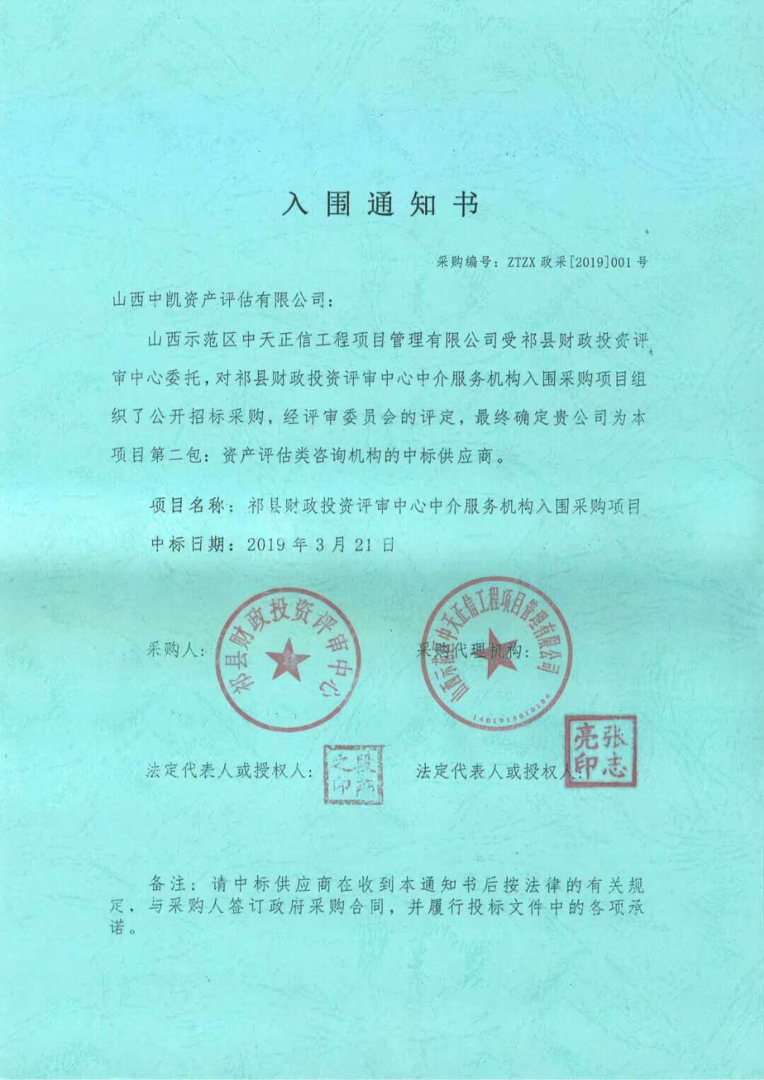 据2019年3月21日山西政府采购网发布的中标公示,山西中凯资产评估有限公司入围祁县财政投资评审中心中介服务机构入围采购项目(项目编号:ZTZX政采[2019]001号)。该项目共三包,中凯评估入围该项目第二包资产评估类咨询机构。