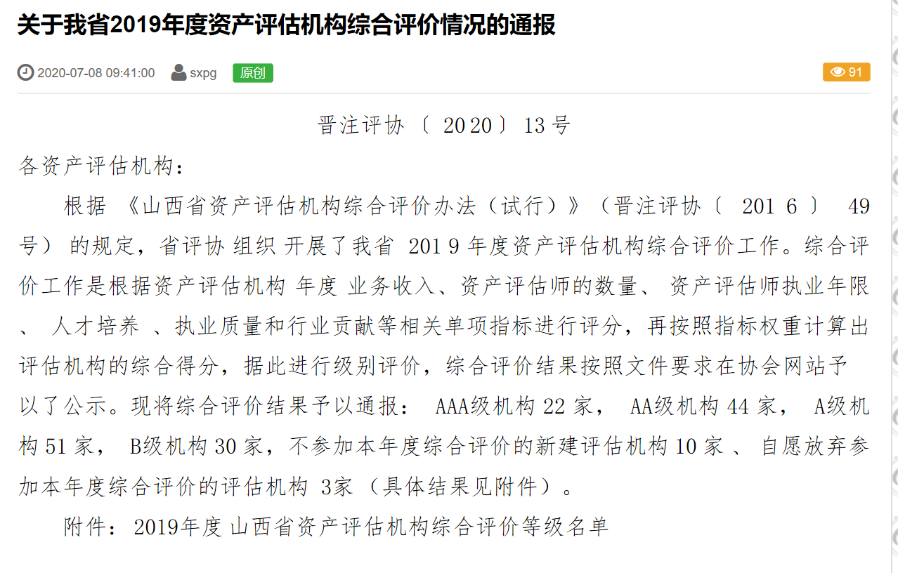 据山西省注册评估师协会《关于我省2019年度资产评估机构综合评价情况的通报》称,本次评价,省评协根据《山西省资产评估机构综合评价办法》综合考虑了执业质量、人才培养、执业年限、行业贡献和业务收入等因素。评价结果显示:全省22家机构被评为AAA级,44家机构被评为AA级,51家机构被评为A级,30家机构被评为B级。