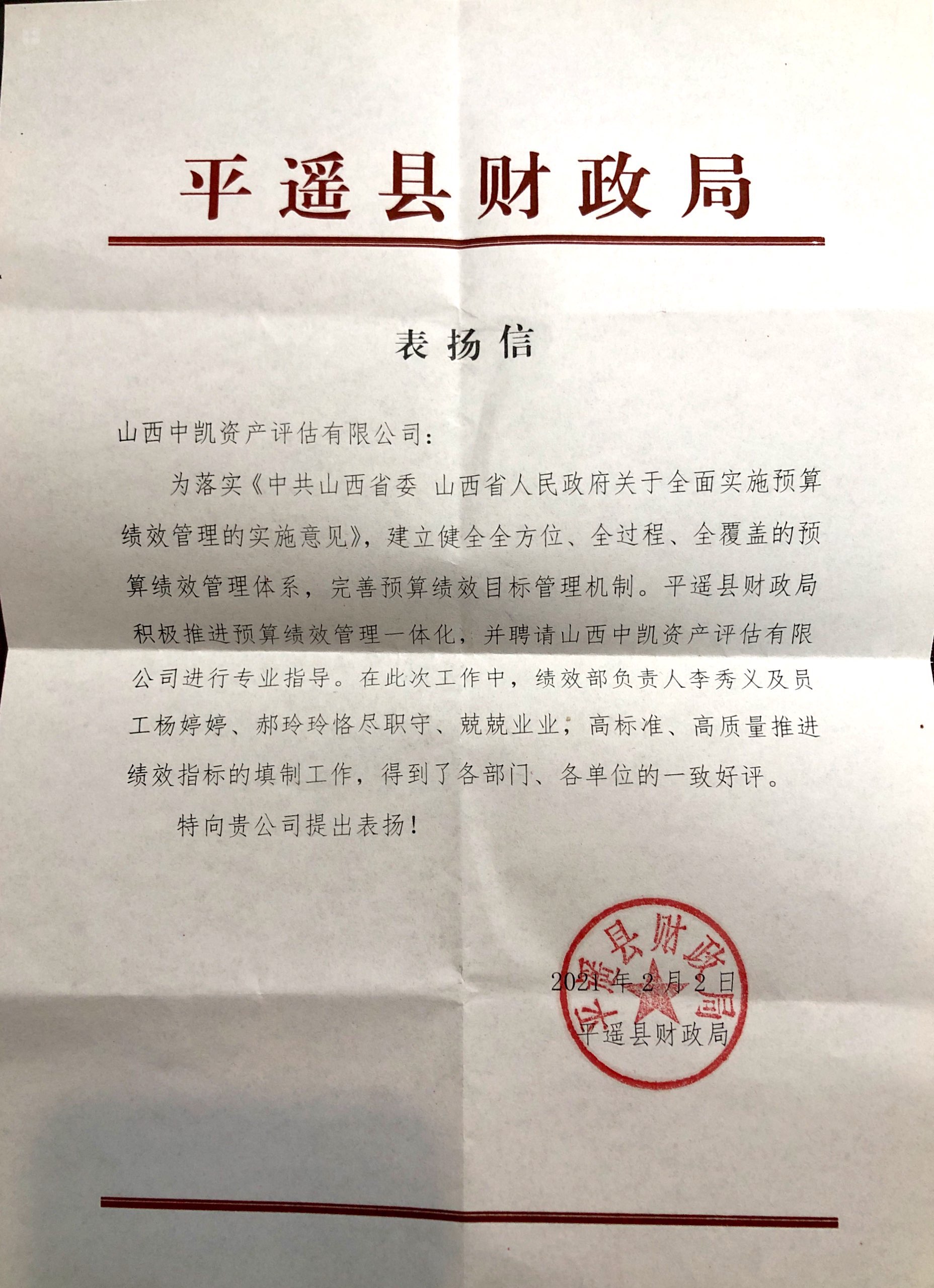 2月2日,山西中凯资产评估有限公司收到平遥县财政局的一封表扬信。表扬中凯公司服务该县预算绩效管理,并提供了宝贵的业务指导。尤其对公司副总李秀义、绩效评价部杨婷婷、郝玲玲恪尽职守、兢兢业业的工作作风给予了充分肯定。