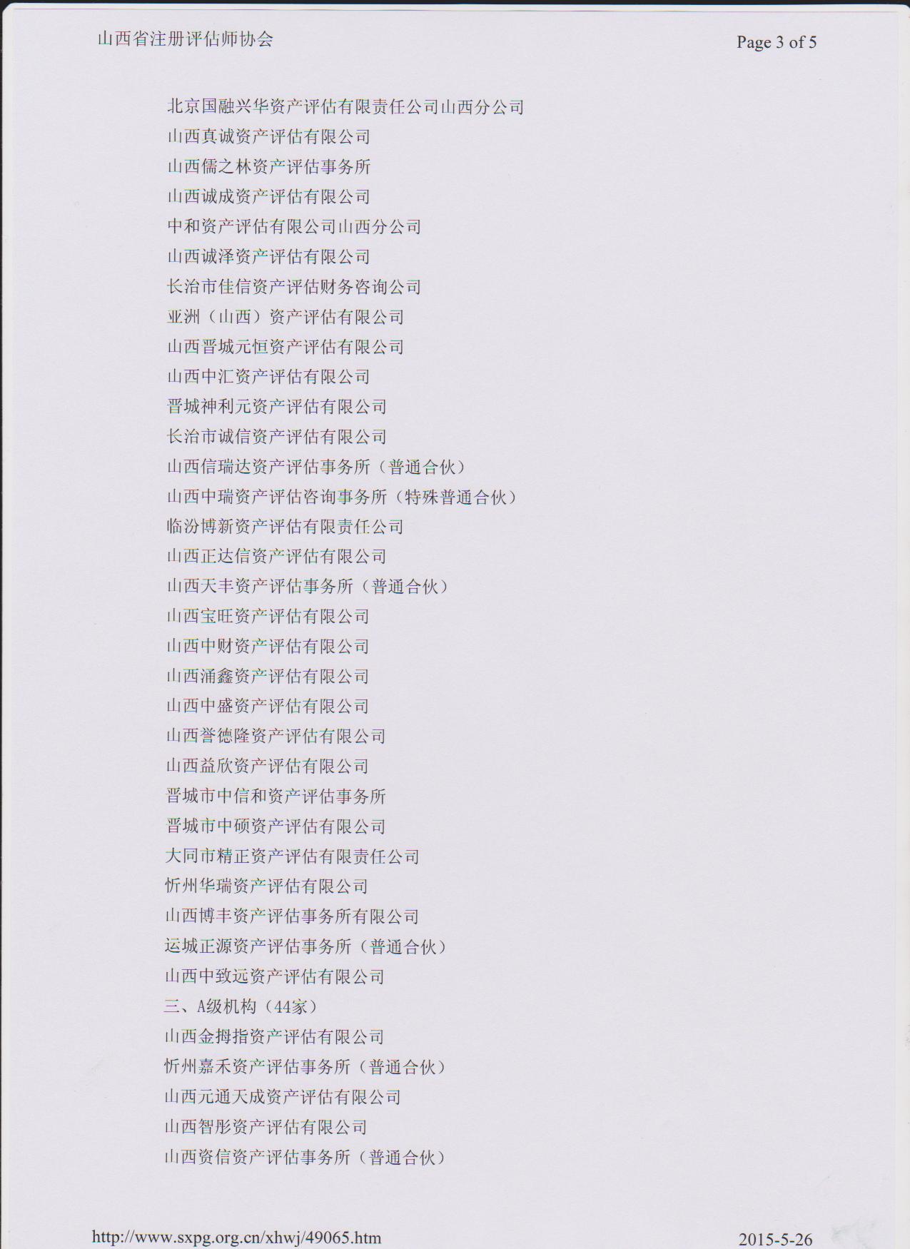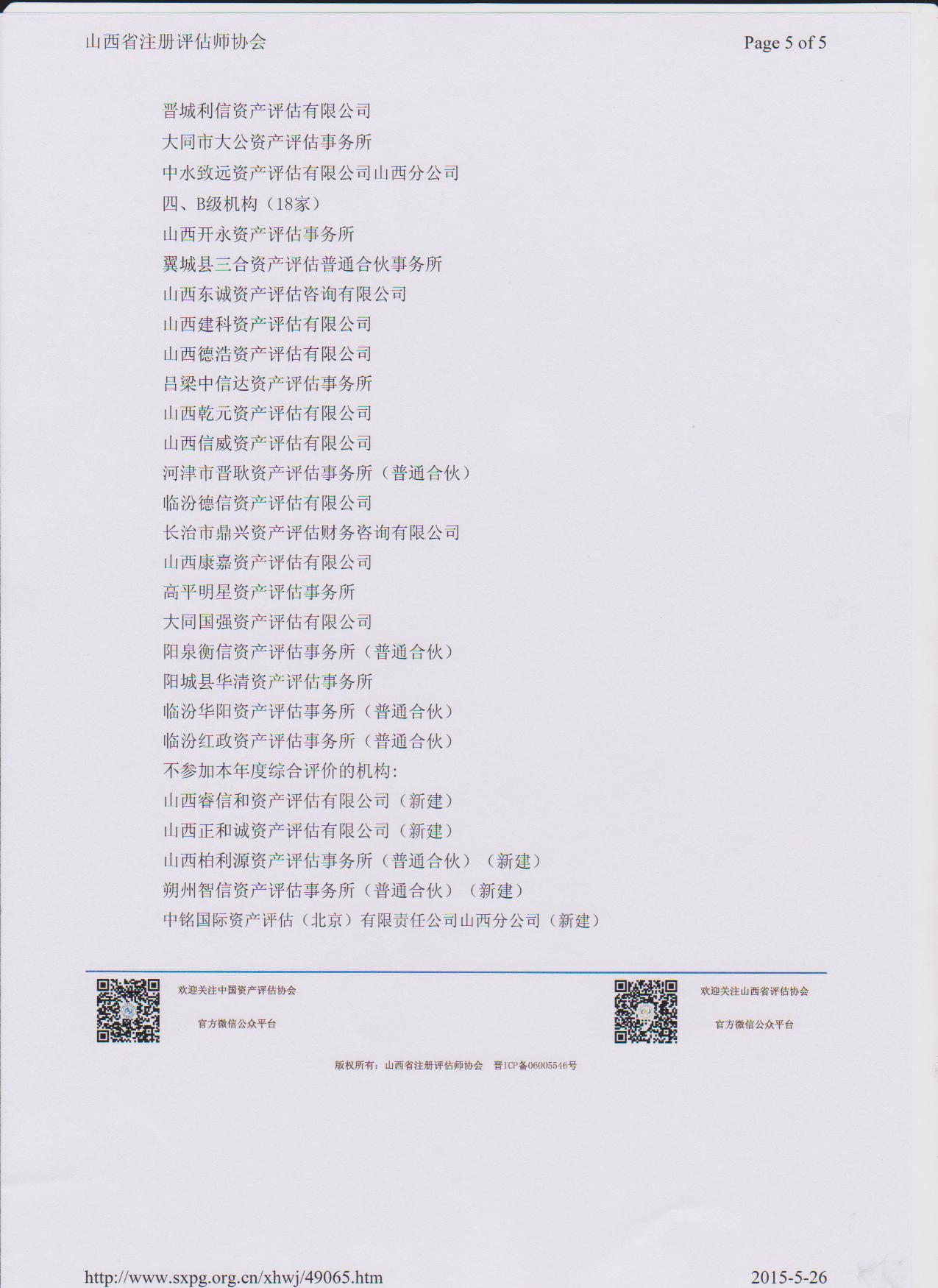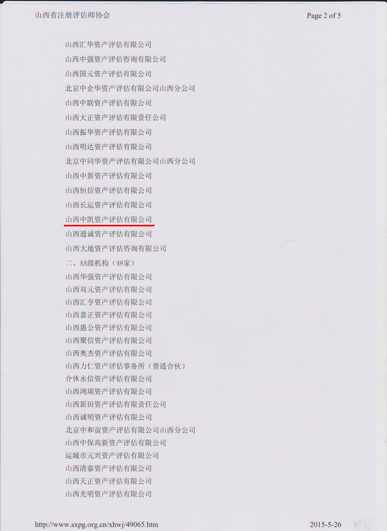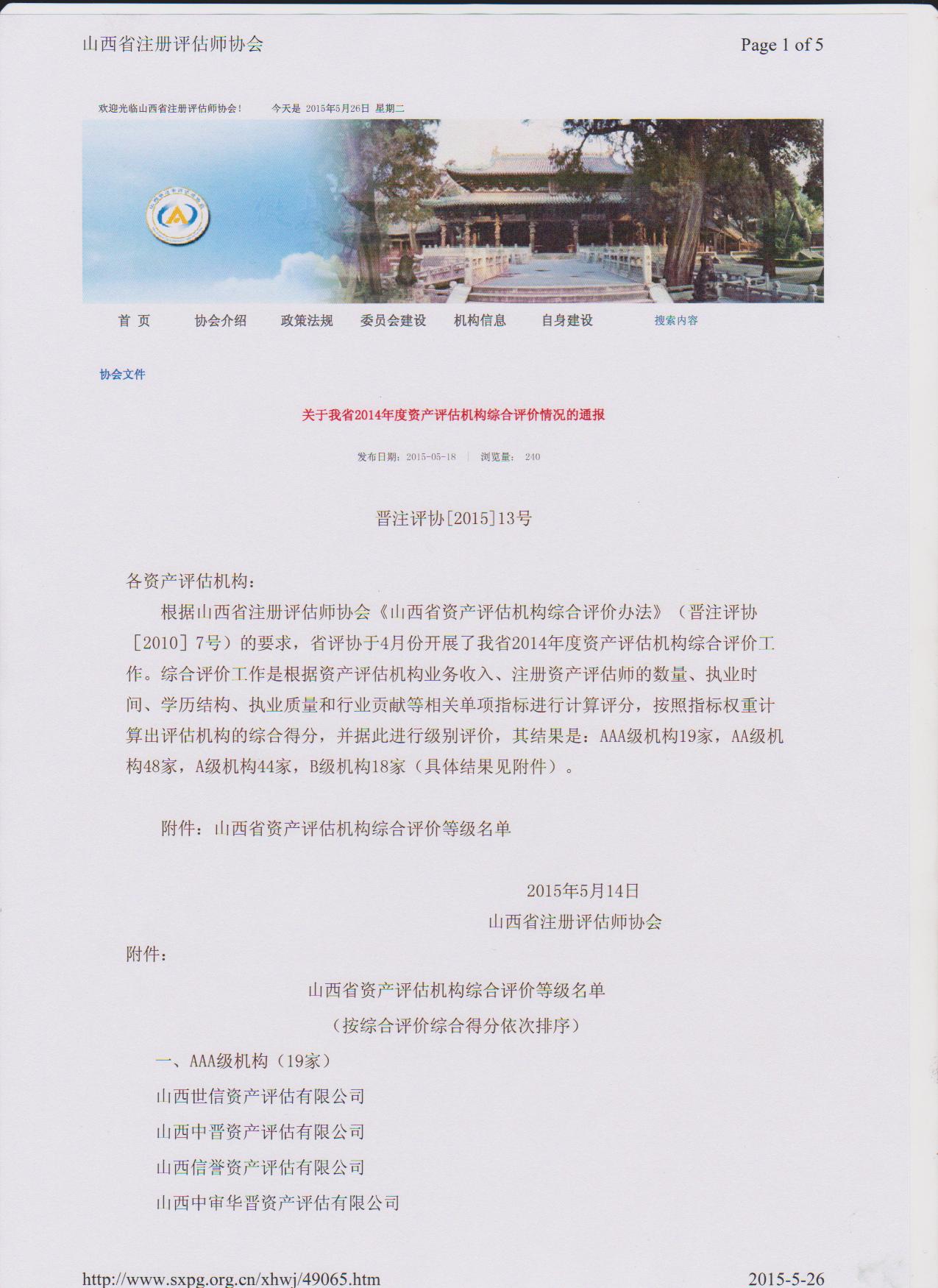2015年5月14日,从山西省注册评估师协会获悉,山西中凯资产评估有限公司被山西省注册评估师协会评为“2014年度资产评估机构综合评价AAA级机构”。