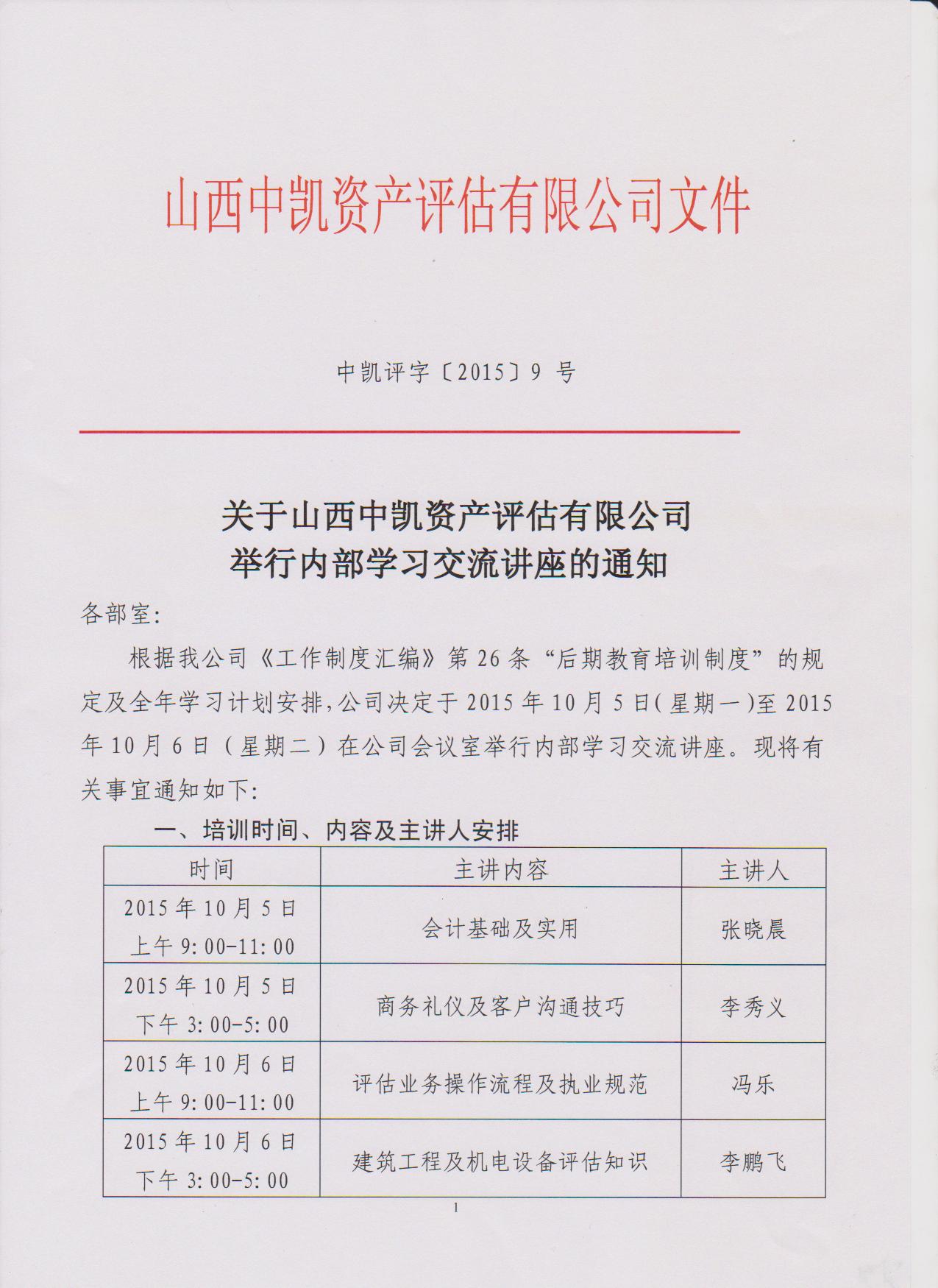 关于山西中凯资产评估有限公司举行内部学习交流讲座的通知